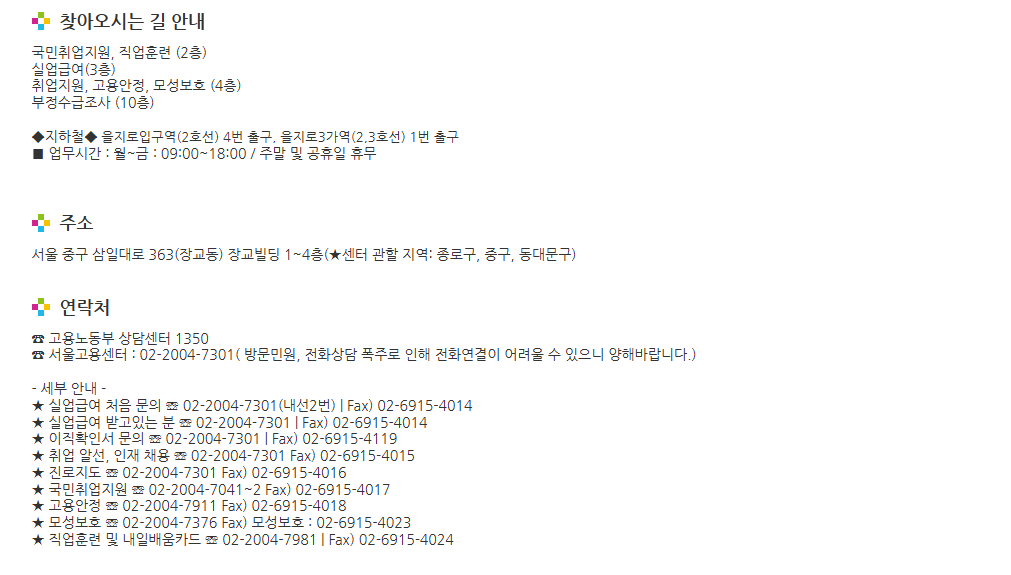 찾아오시는 길 안내 국민취업지원, 직업훈련 (2층) 실업급여(3층) 취업지원, 고용안정, 모성보호 (4층) 부정수급조사 (10층) ◆지하철◆ 을지로입구역(2호선) 4번 출구, 을지로3가역(2,3호선) 1번 출
