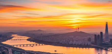 아차산 해맞이 광장에서 바라본 서울 시내와 한강 일출 풍경